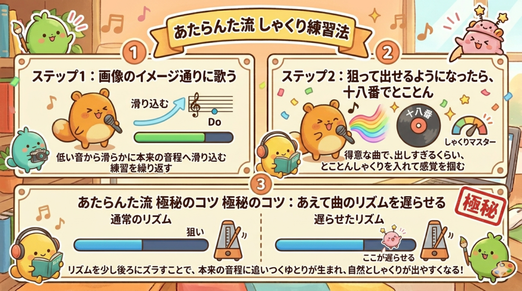 正直、具体的にしゃくりを出すあたらんた流のコツとしてはあえて曲のリズムを遅らせて歌うことです。